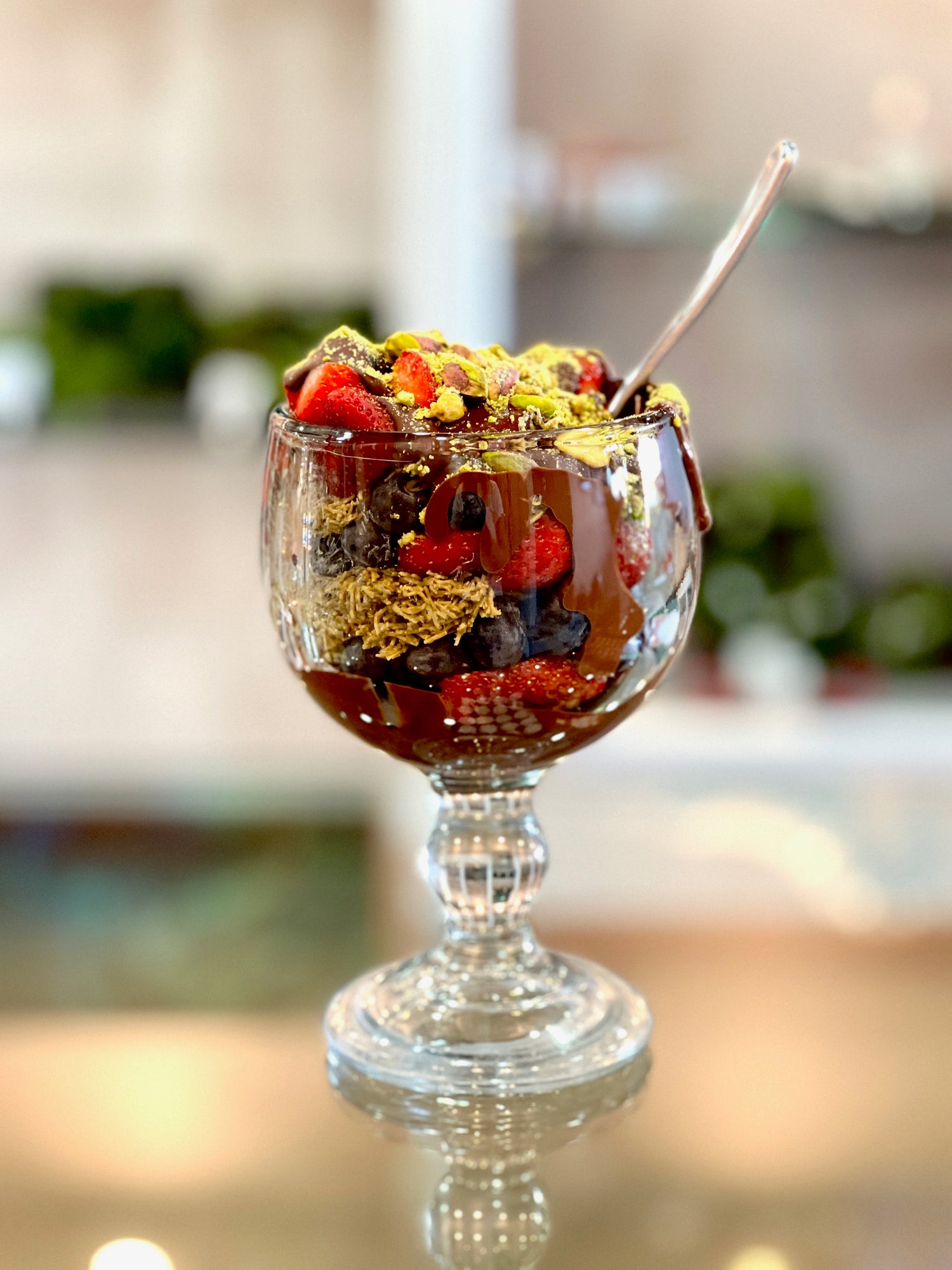 Treat yourself to the Dubai Berry Cup - a delightful blend of fresh berries and exquisite Dubai filling, accompanied by your preferred fountain milk or dark chocolate - customized and served fresh at our Beaverton spot!
