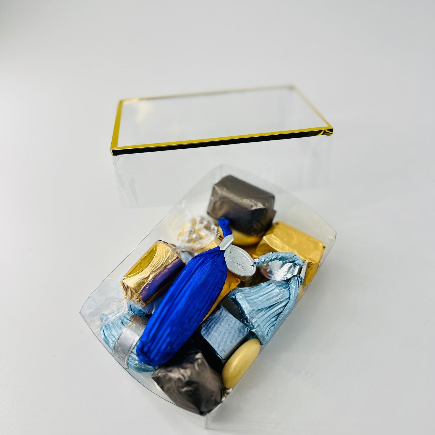 A hand selected assorted of Milk and Dark Chocolates, Candy Coated Jordan Almonds, and Edible Beads in a Clear Box tied with a satin Ribbon - this beautiful gift will impress!