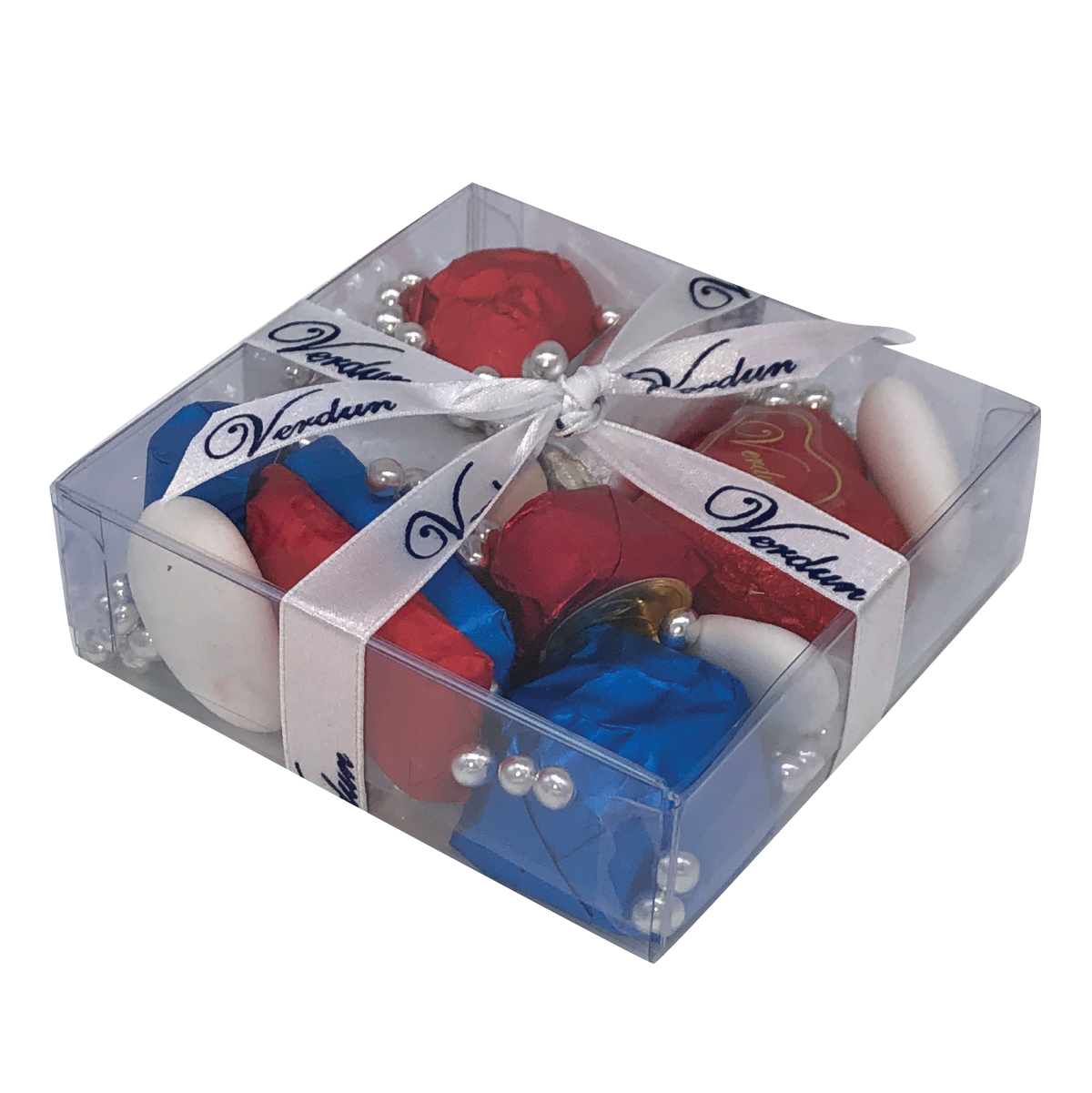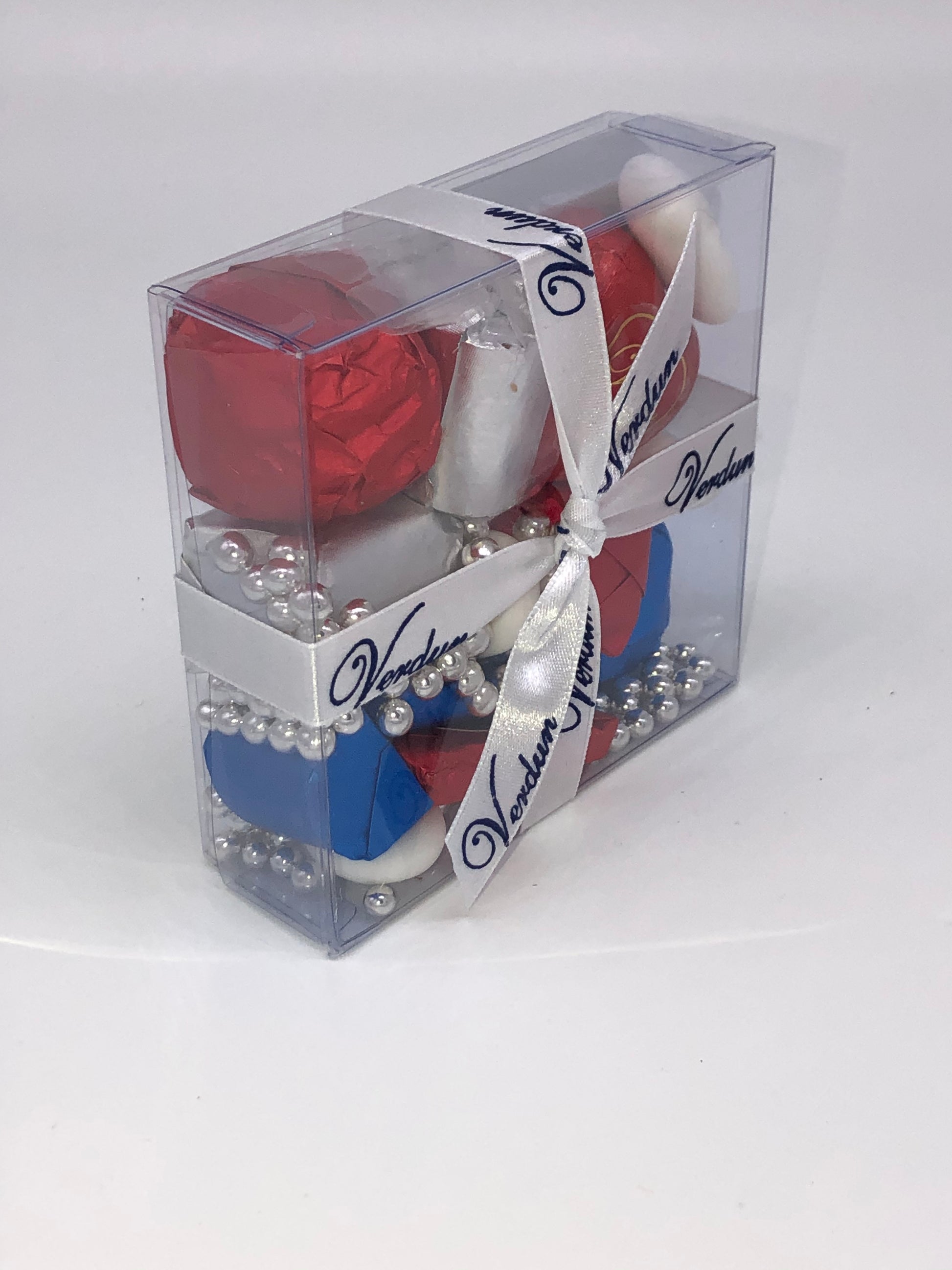 A hand selected assorted of Milk and Dark Chocolates, Candy Coated Jordan Almonds, and Edible Beads in a Clear Box tied with a satin Ribbon - this beautiful gift will impress!